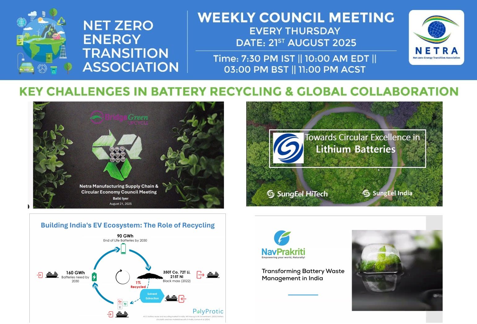 • The Netzero Energy Transition Association (NETRA) recently convened an insightful council meeting under its platform, focusing on Battery Recycling – Challenges and Global Collaboration.